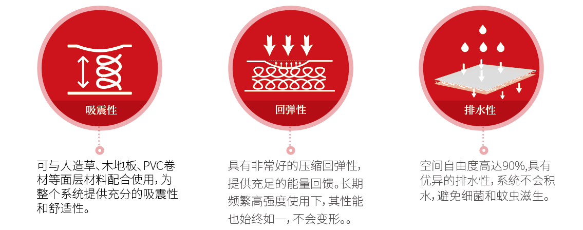 三维尼龙弹性垫的优点 三维尼龙弹性垫最独特之处在于其材料和结构:芯层是尼龙单丝,尼龙具有优异的回弹性,加上中空的三维结构,使垫层不但 有吸震性,而且有很好的回弹性,即很好的能量回馈。采用三维尼龙弹性垫的场地,不但安全,而且充满能量,不易疲倦。上下两层织物是纺粘的PET无纺布,对温度不敏感,十分稳定。同时,三维缓冲垫的自由空间高达90%,具有十分快速的排水性能,确保整个系统不会积水。