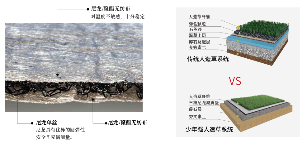三维尼龙弹性垫的优点 三维尼龙弹性垫最独特之处在于其材料和结构:芯层是尼龙单丝,尼龙具有优异的回弹性,加上中空的三维结构,使垫层不但 有吸震性,而且有很好的回弹性,即很好的能量回馈。采用三维尼龙弹性垫的场地,不但安全,而且充满能量,不易疲倦。上下两层织物是纺粘的PET无纺布,对温度不敏感,十分稳定。同时,三维缓冲垫的自由空间高达90%,具有十分快速的排水性能,确保整个系统不会积水。